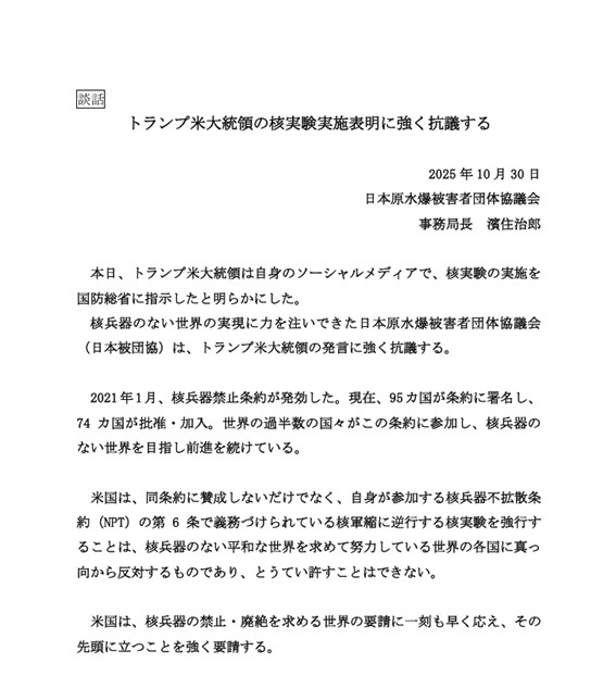 奈良県生活協同組合連合会は「米トランプ大統領が核実験実施を指示したことに抗議する談話」を支持します