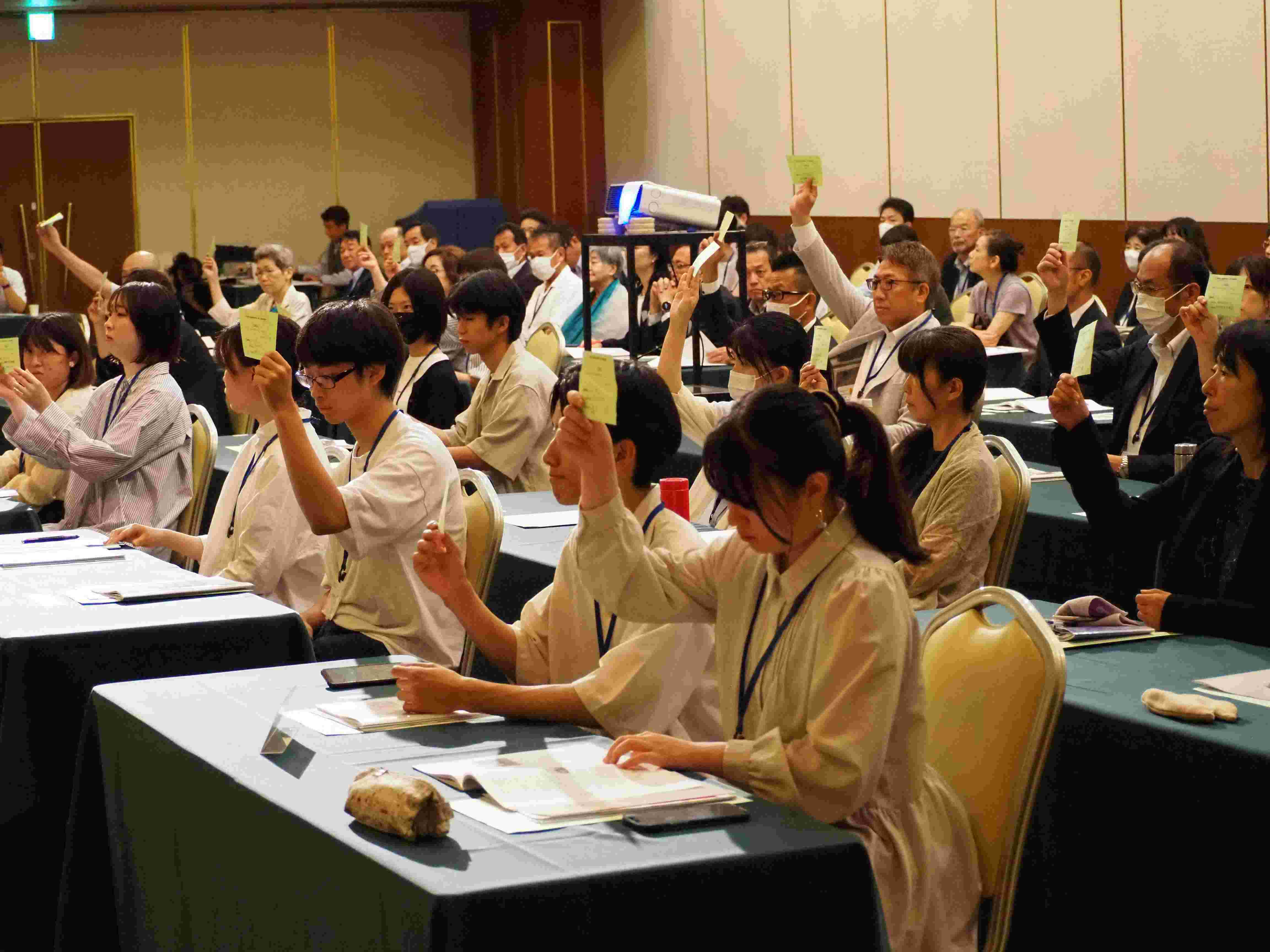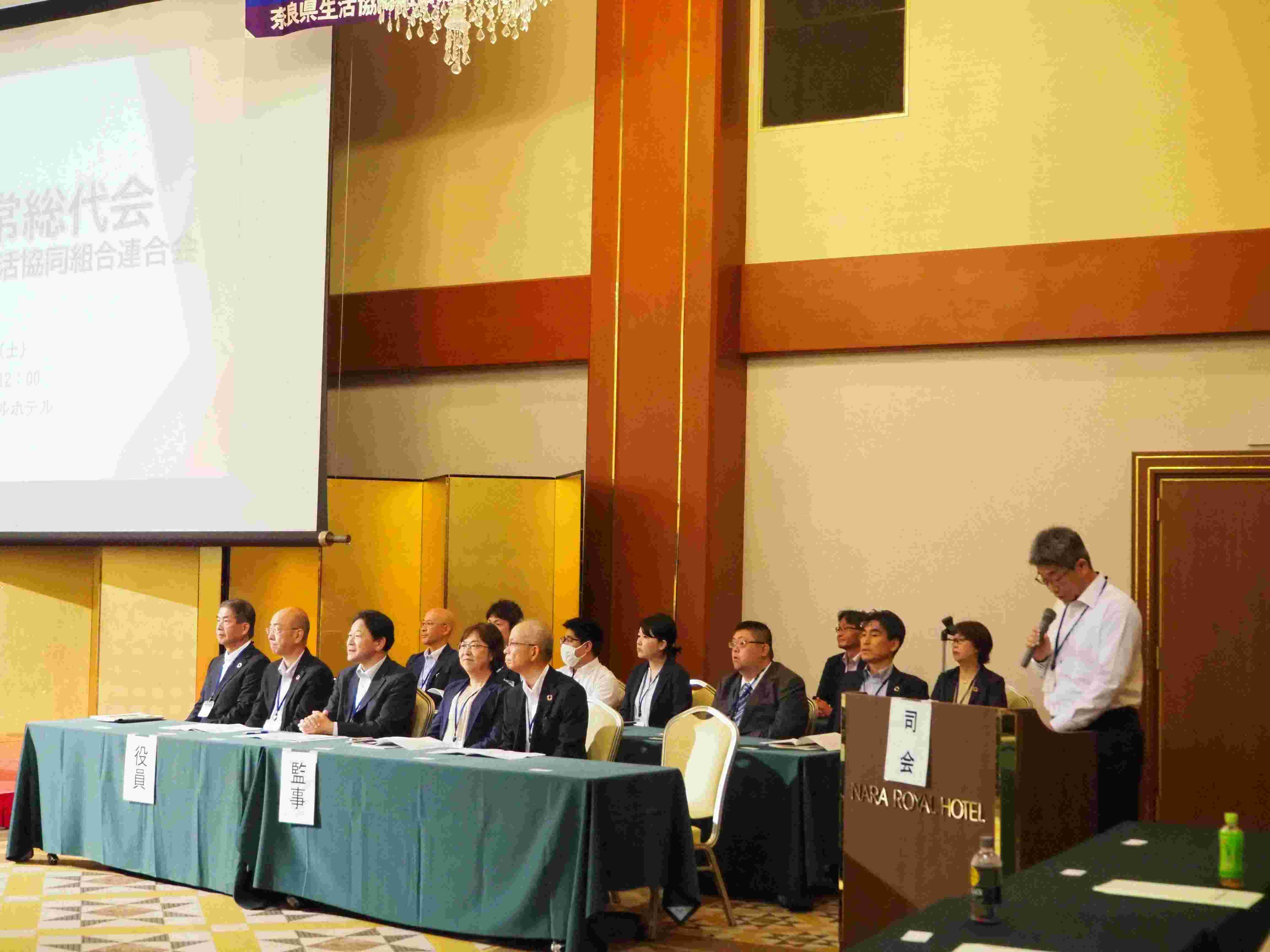 ご来賓19名、理事12名・監事2名、代議員27名(内委任1名・書面議決1名)、オブザーバー43名、事務局を含む総勢102名(実出席100名)が出席・参加し、奈良県生協連の1年間の取り組みや会員生協の活動報告を共有しました。