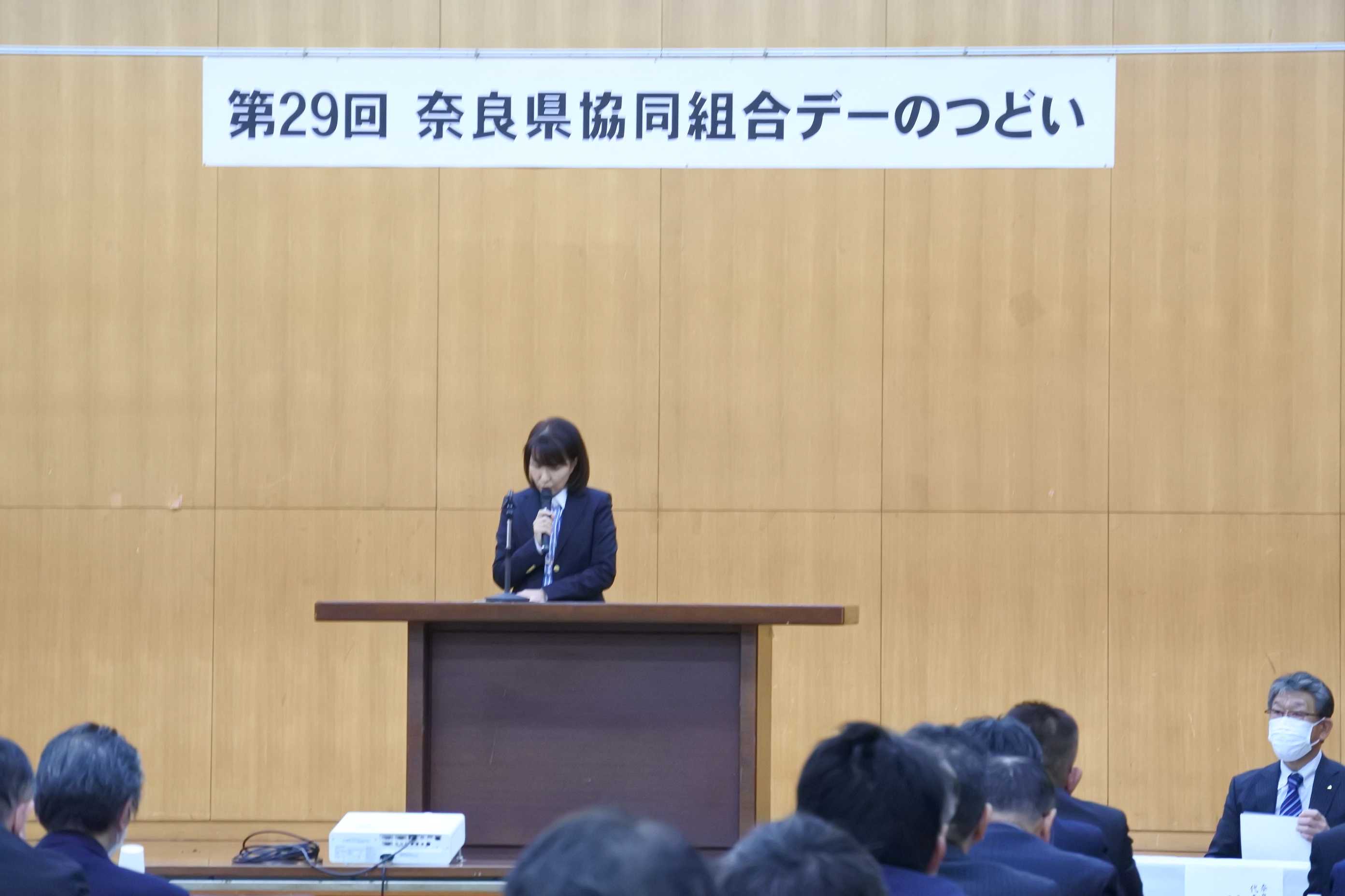 第29回奈良県協同組合デーのつどいが12月6日農協会館5階にて開催され89人が参加しました。協同組合デーのつどいは奈良県協同組合連絡協議会(奈良県農業協同組合中央会、奈良県農業協同組合、全国共済農業協同組合連合会奈良県本部、奈良県森林組合連合会、奈良県生活協同組合連合会)の主催で県内協同組合間協同の促進と情報交換を図るため毎年開催されています。