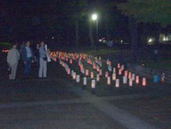 映画上映の後、同会館入口前エントランスにローソクのモールを作成。参加者は各自映画を見て感じたこと含め平和への思いをメッセージに託し、幻想的な淡い灯りの中で他のメッセージに見入っていました。