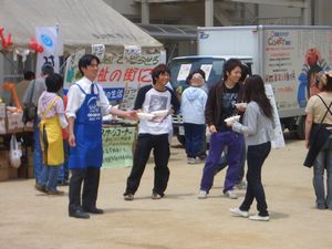 | 学生と職員が一緒になって試食をおすすめ中! |