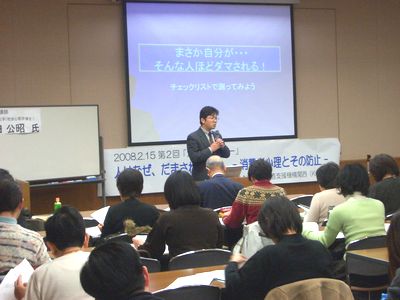 はじめに、静岡県立大学准教授西田公昭氏が「「人はなぜ、だまされるのか?‐ 消費者の心理とその防止-」をテーマに心理チェックをまじえた参加型講演があり、後段グループ別に分散会形式で事例研究、これを受けて最後に全体発表会が行われました。