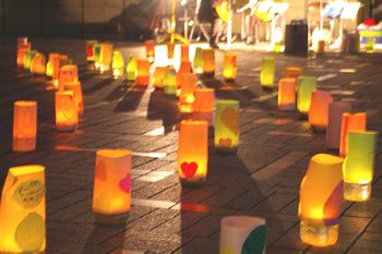奈良市内ならまちセンター市民ホールと同コミュニティー広場を使ってピース実行委員会主催で開催しました。全体約120名が参加、同時開催として「サークルおてんとさん」によるソーラーランタン作り講習会も実施され、ピースキャンドルではソーラーランタンも点灯いただきました。